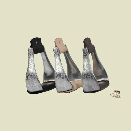 Bring a touch of bling to your Western outfit with these beautiful floral engraved aluminum western stirrups.