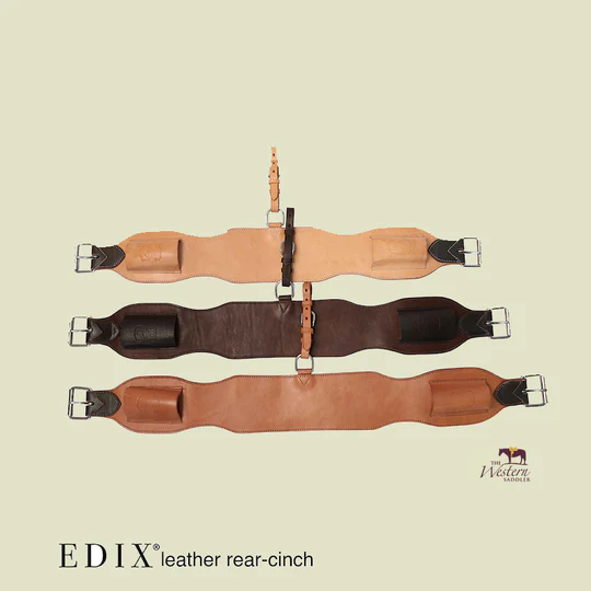 A rear cinch is a safety piece that stabilizes the saddle by attaching with aid of rear billets and a leather hobble strap to the front cinch. The back cinch holds your saddle snug and level to your horse’s barrel, alleviating pressure to his withers because the saddle doesn’t shift forward during maneuvers.